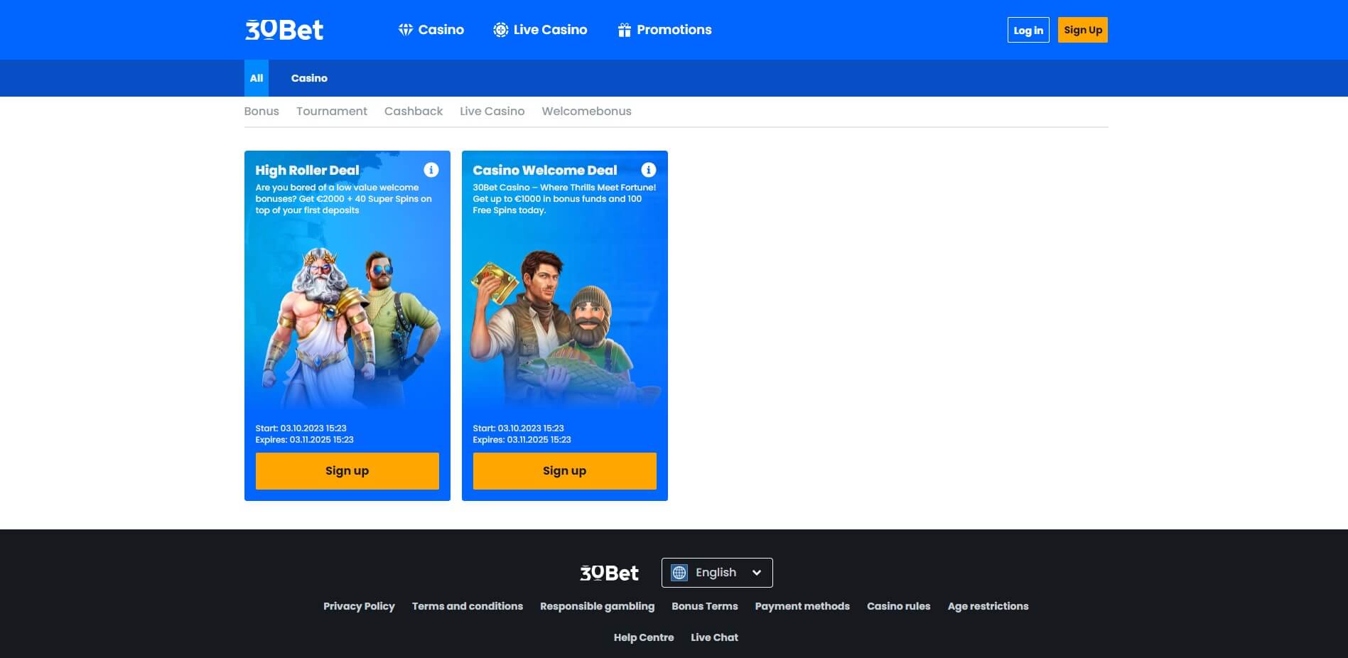 Sport Cashback – De 30Bet Casino-website betaalt je 5% van je verliezen op sportweddenschappen terug in contanten. Er zijn geen inzetvereisten en geen verplichtingen. Claim elke maandag tot €300 via de bonuspagina.